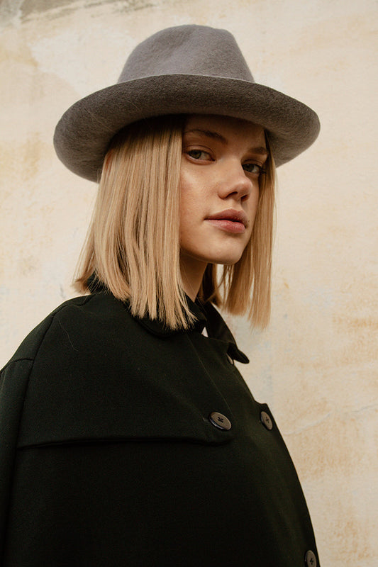 A person wearing a gray fedora hat with a curved brim and center-dent crown, paired with a black overcoat.